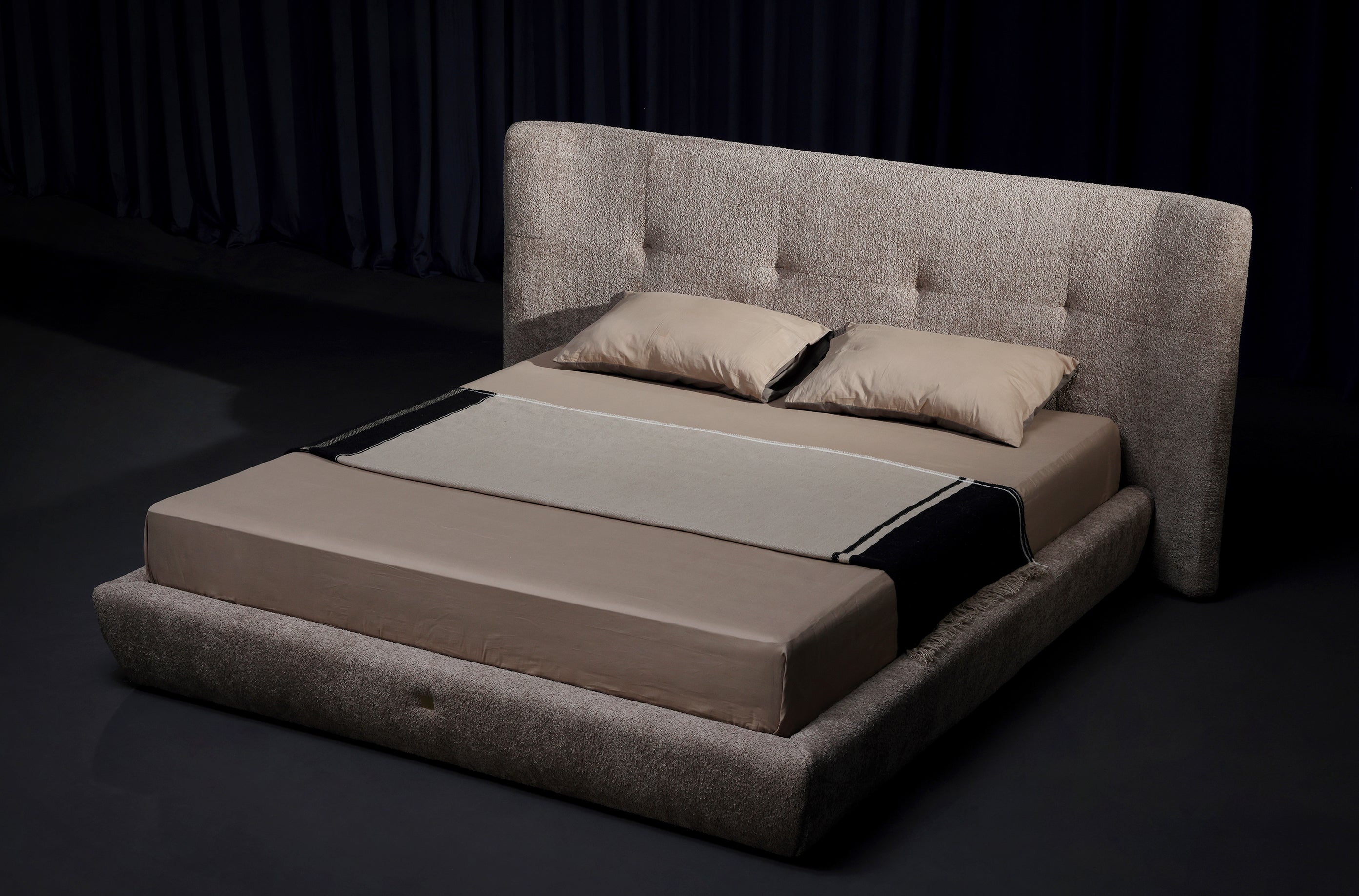 Its creation began with a rigorous pursuit of softness. After testing dozens of materials, we chose modern particle velvet fabric—a textile that preserves the skin-friendly feel of traditional velvet while offering a lighter, more breathable touch that softens the visual weight of a high headboard.