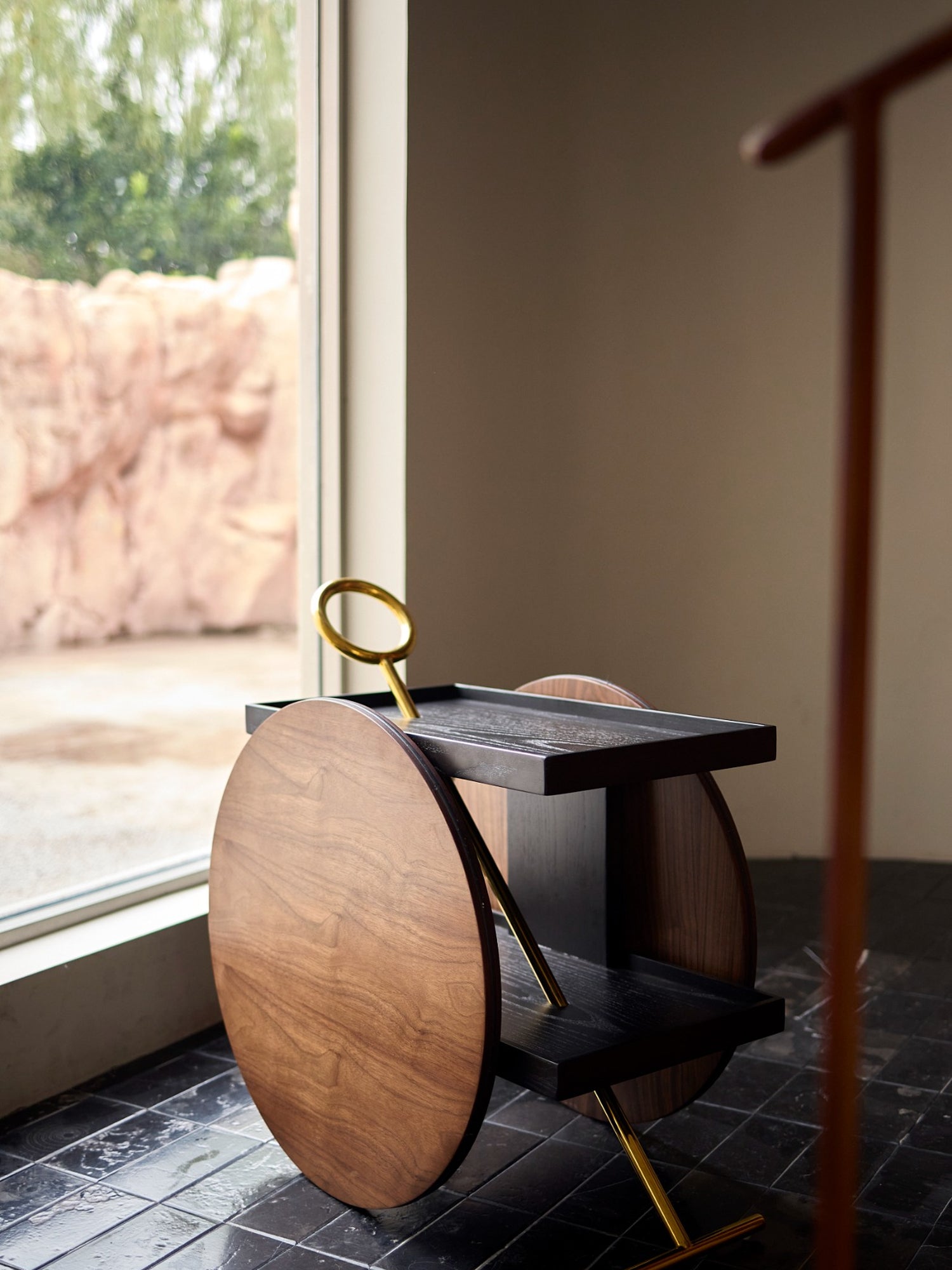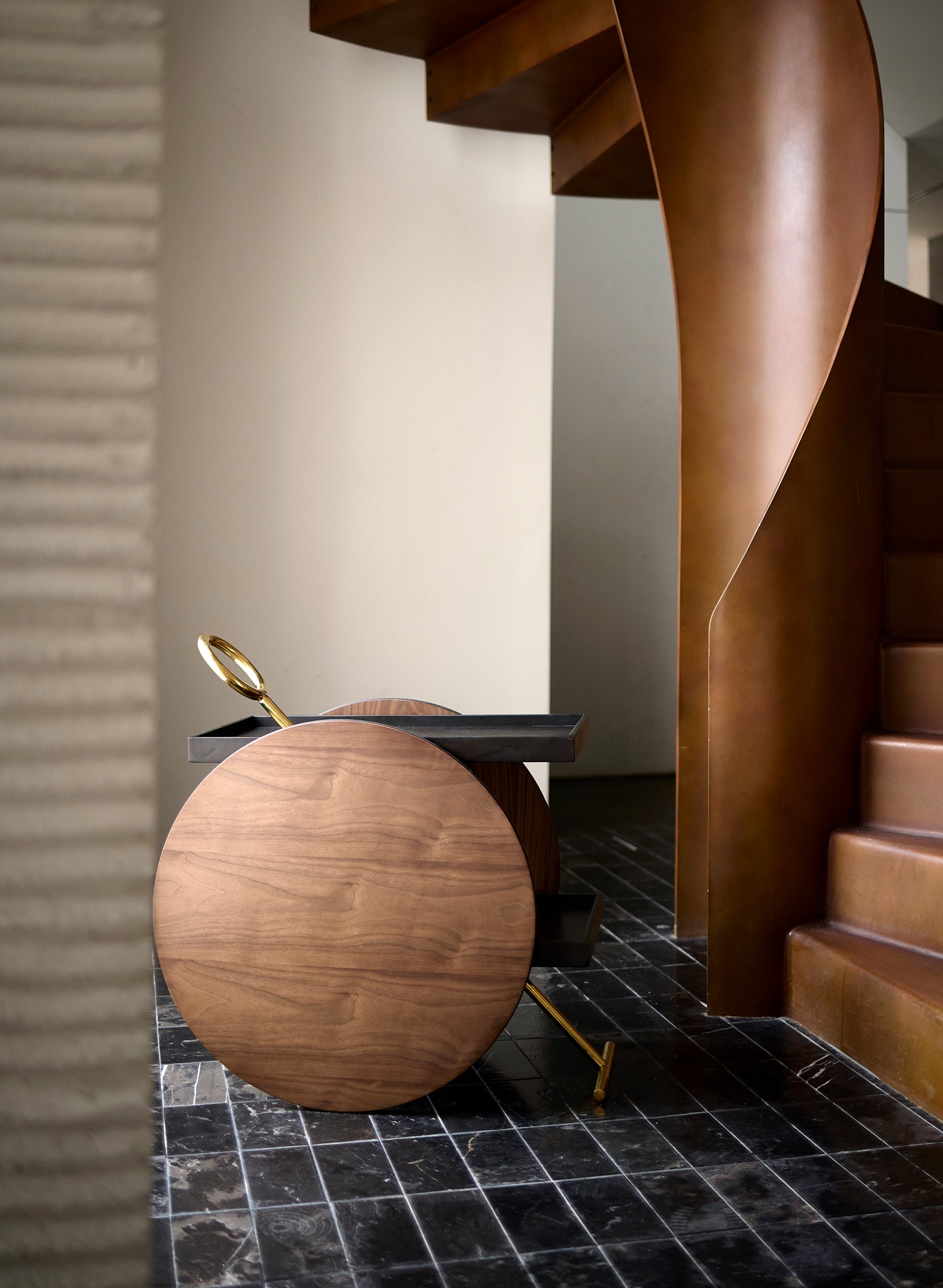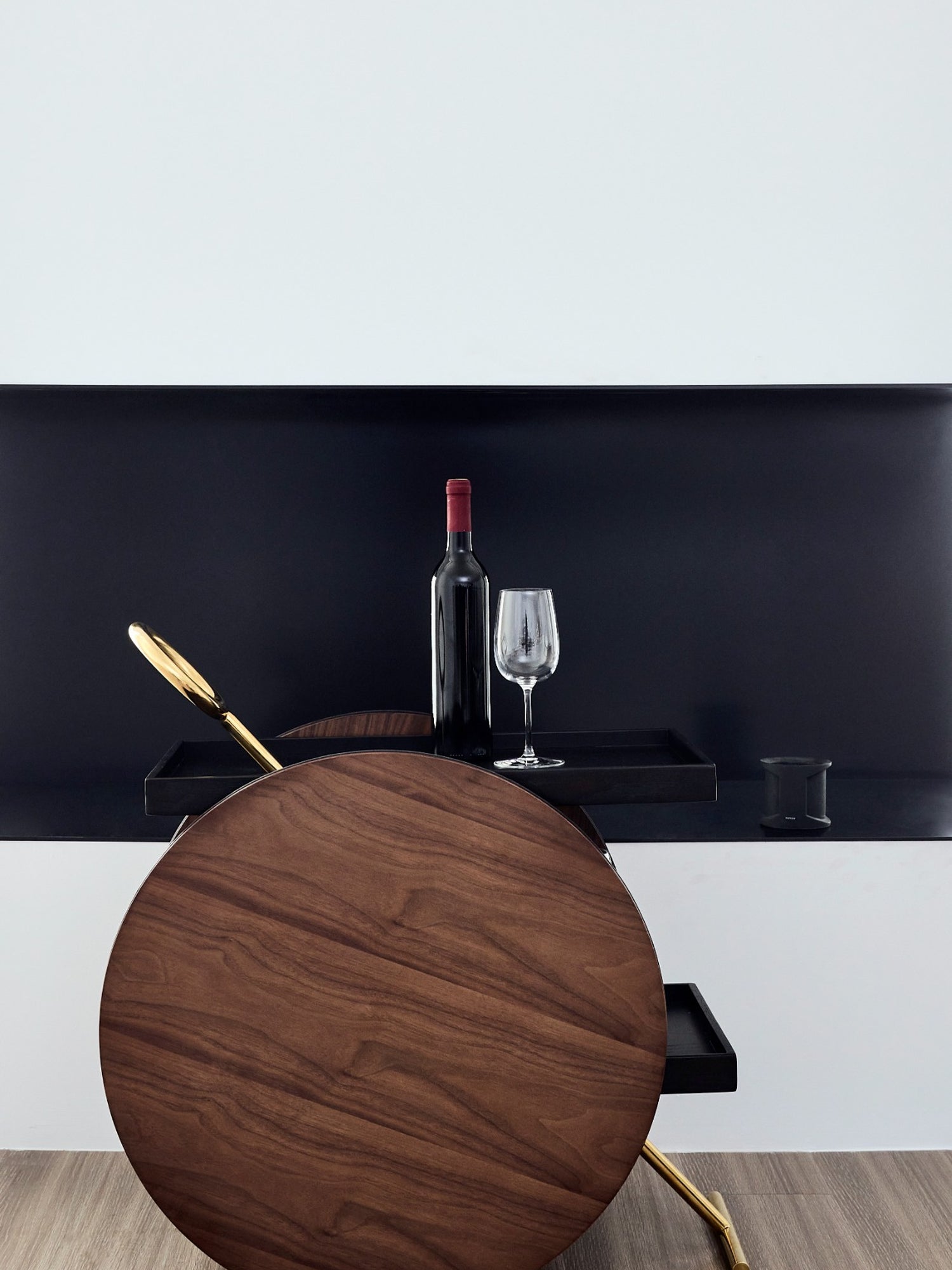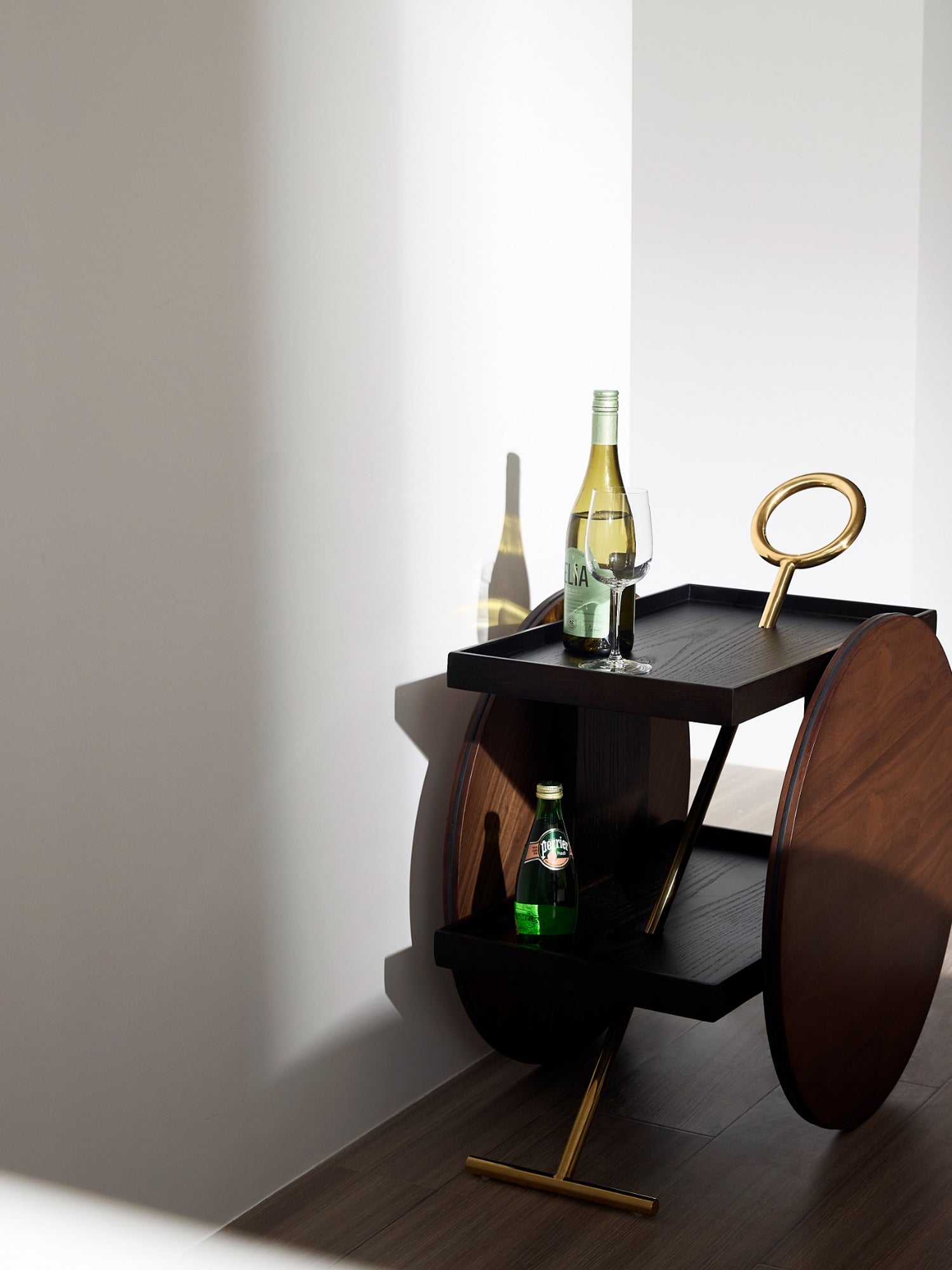 Rituals give shape to time. After many evenings sketching over a glass of wine, we set out to create a serving trolley that could honor those small ceremonies every day. The result is Lunar Trolley—a sculptural piece in solid wood, defined by two grand circular panels and a hand-polished brass ring that crowns the form like a halo. A slender brass spine meets shadow-toned trays with raised lips; proportions are exacting, joinery discreet, and the wood grain flows in calm continuity. Reposition it beside a sofa for books and flowers, roll it into a dining scene for wine and glassware, or let it stand quietly as an objet—its presence elevates the room without noise.