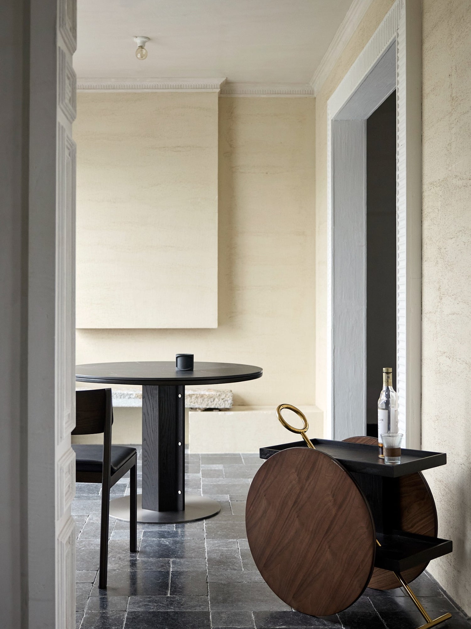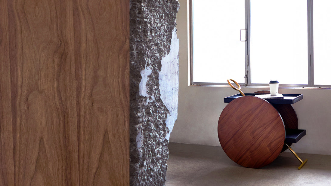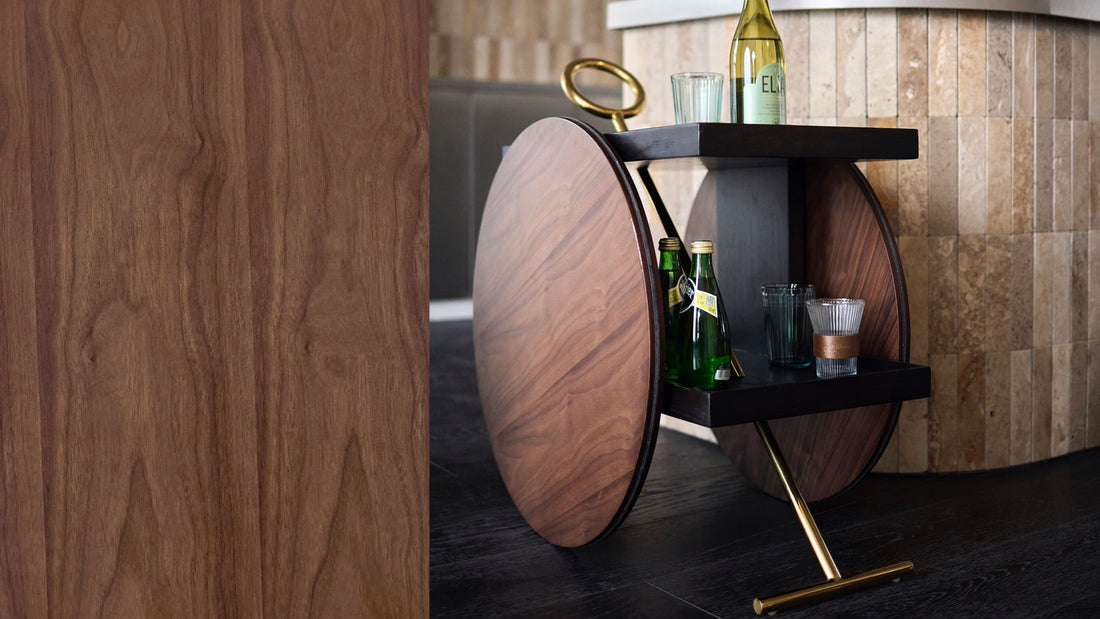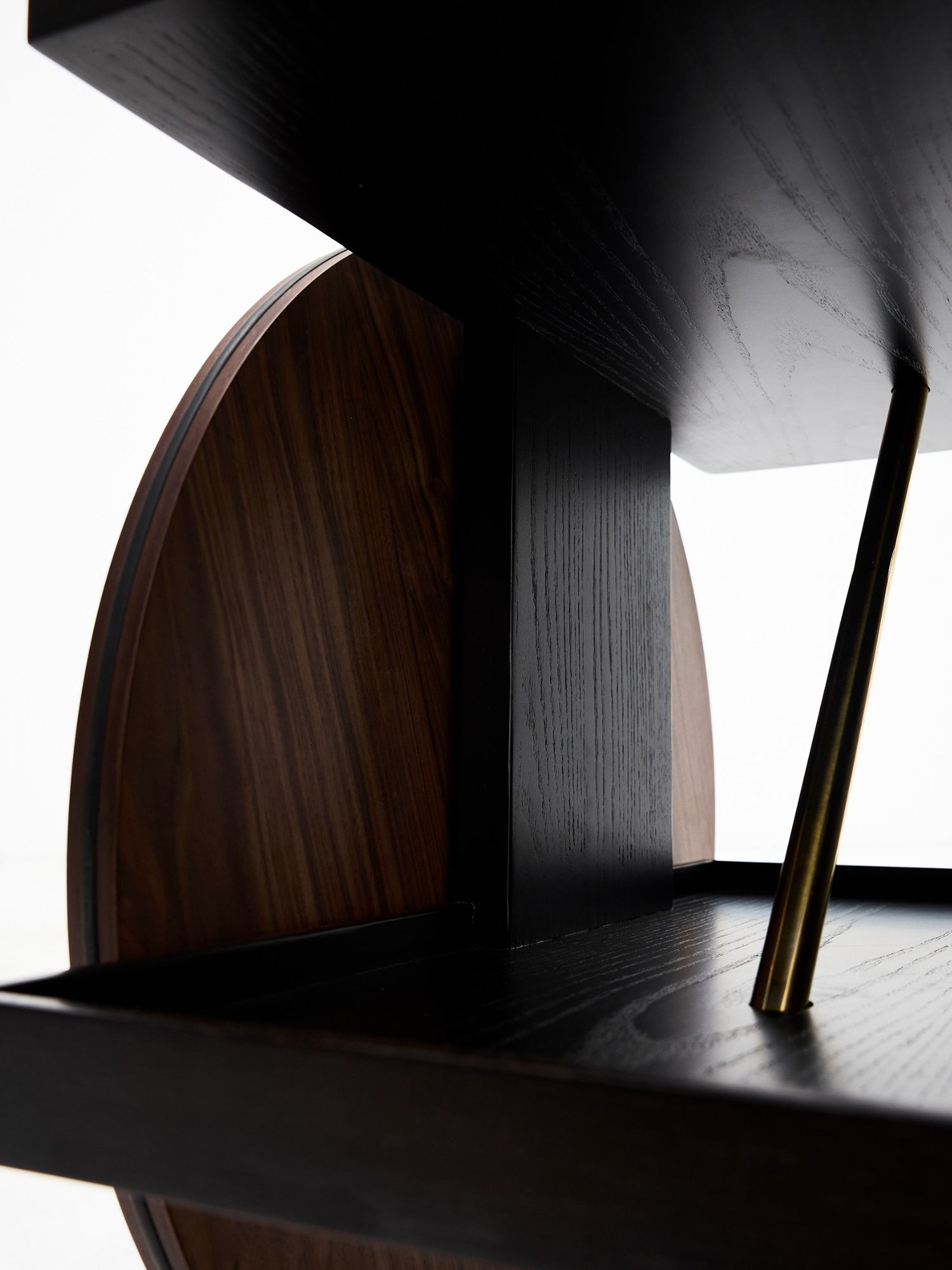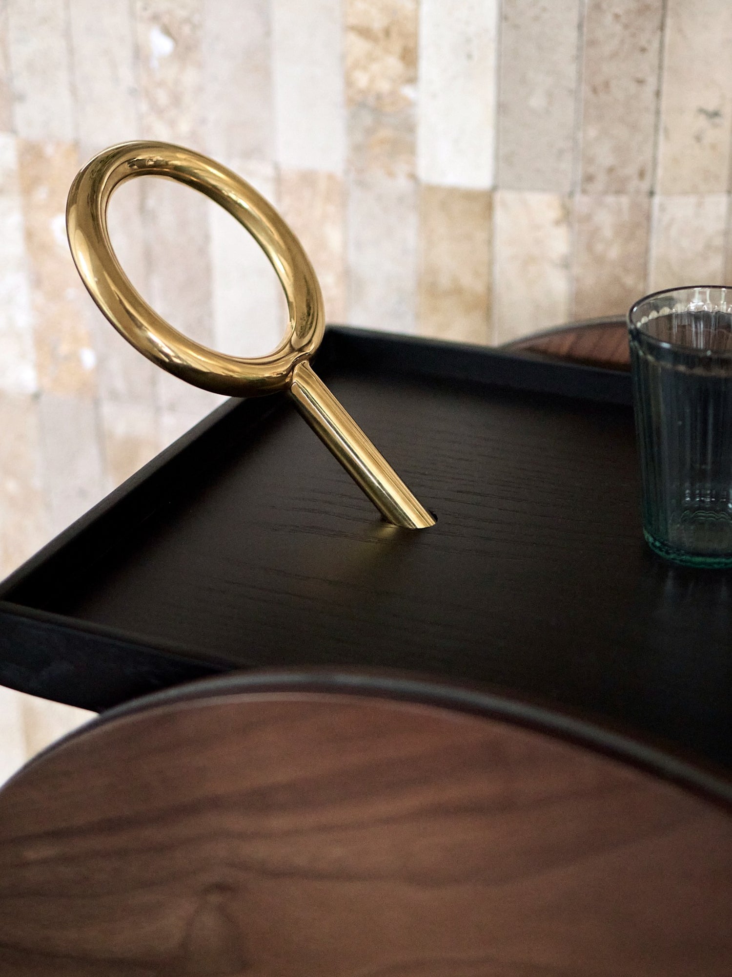 Rituals give shape to time. After many evenings sketching over a glass of wine, we set out to create a serving trolley that could honor those small ceremonies every day. The result is Lunar Trolley—a sculptural piece in solid wood, defined by two grand circular panels and a hand-polished brass ring that crowns the form like a halo. A slender brass spine meets shadow-toned trays with raised lips; proportions are exacting, joinery discreet, and the wood grain flows in calm continuity. Reposition it beside a sofa for books and flowers, roll it into a dining scene for wine and glassware, or let it stand quietly as an objet—its presence elevates the room without noise.