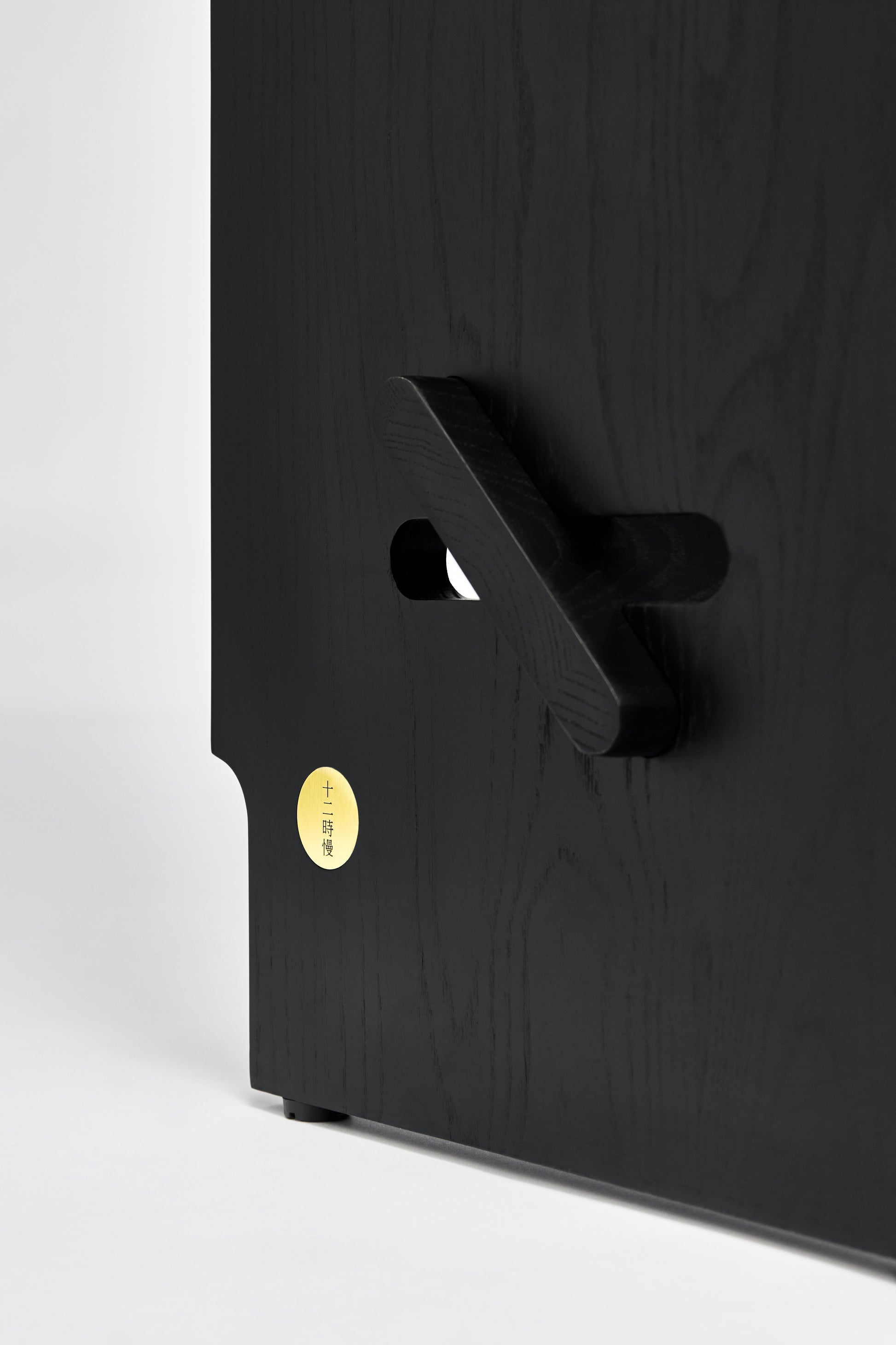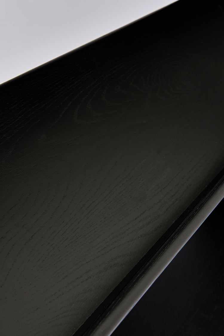 Angled shelves trace the rhythm of restraint — shifting from level to incline with quiet precision. Sculptural side panels frame this motion, where balance becomes design. The dialogue between matte black wood and soft brass accents evokes a serene, gallery-like harmony.