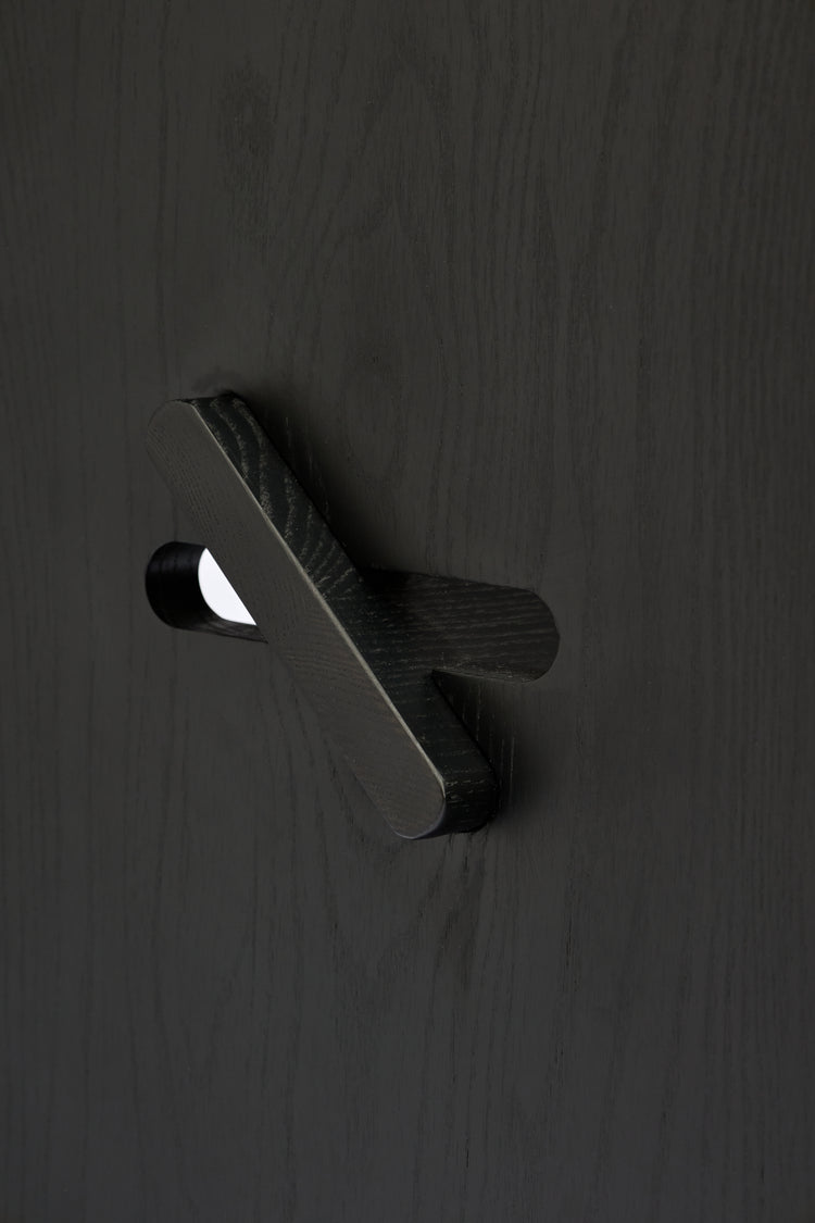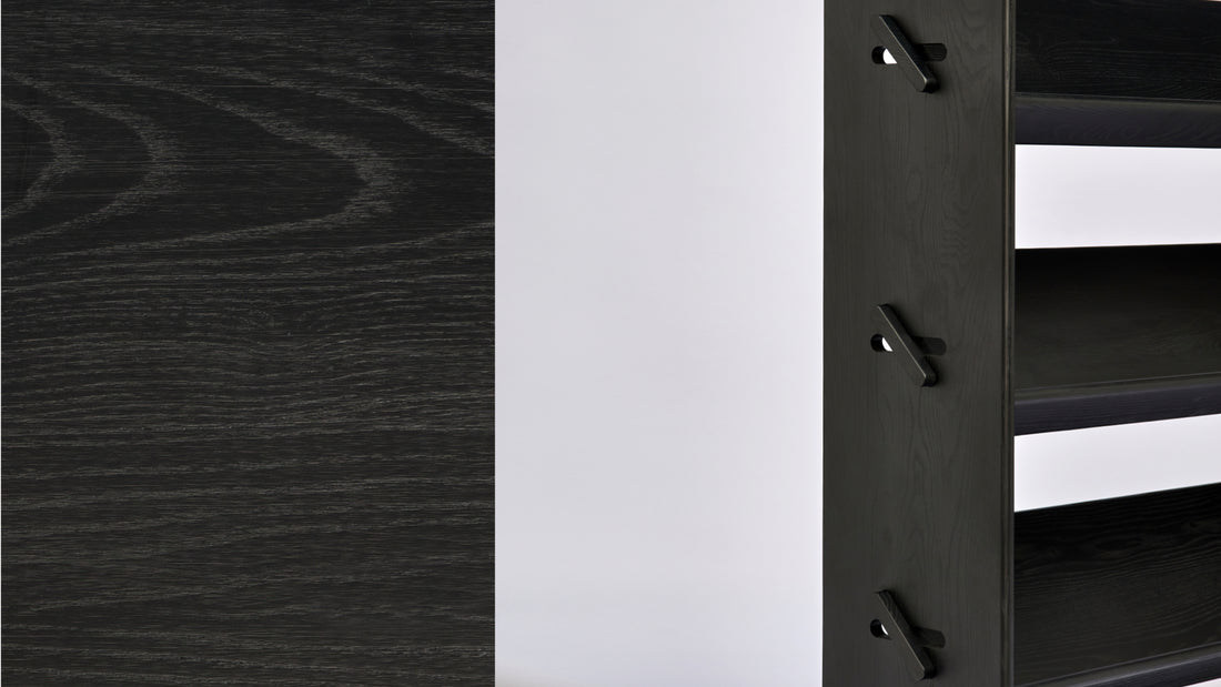 Cross-shaped keys secure each shelf, blending stability with rhythm. A modern echo of traditional joinery.