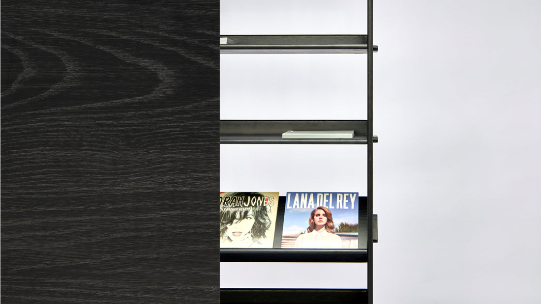 Each shelf pivots between two positions — horizontal for generous storage, or gently inclined for effortless display. A subtle shift in angle transforms function into form, redefining how space holds objects.
