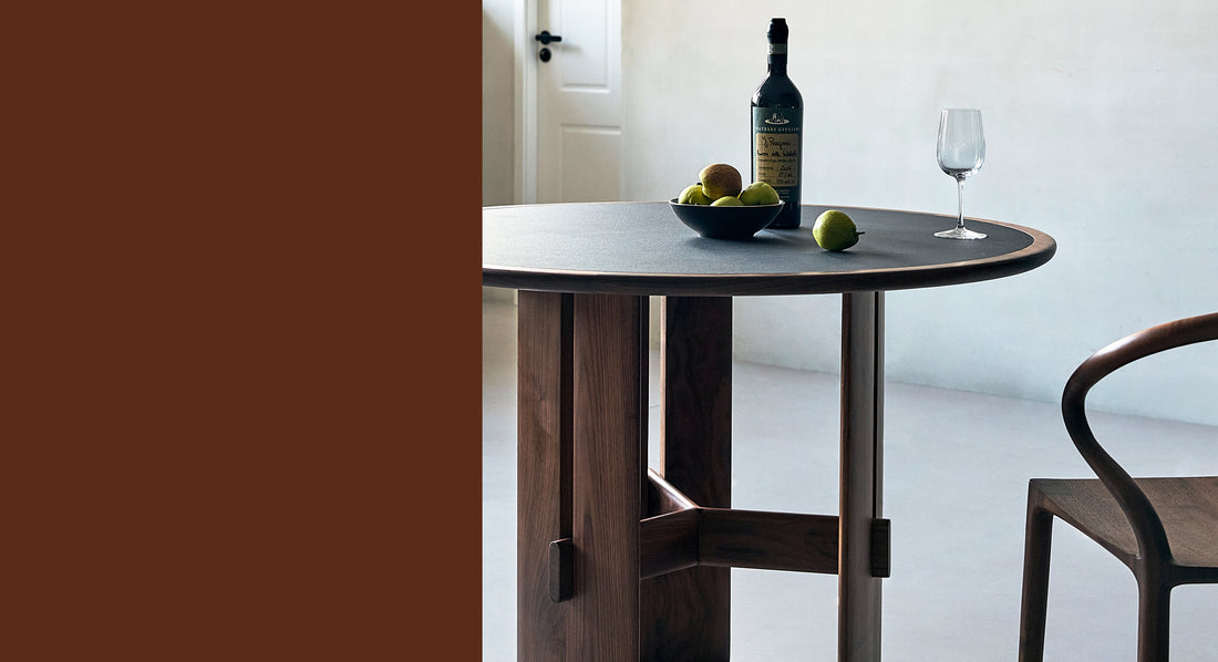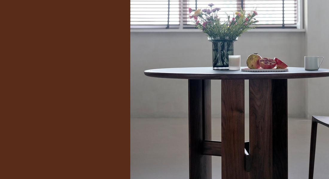 We reimagined traditional joinery by openly combining a trident crossbar structure with solid wood legs, creating both a unique visual statement and a robust, durable base. The tabletop features traditional solid wood edging paired with inlaid thick sintered stone, bringing together heritage craftsmanship and the versatility of modern living.